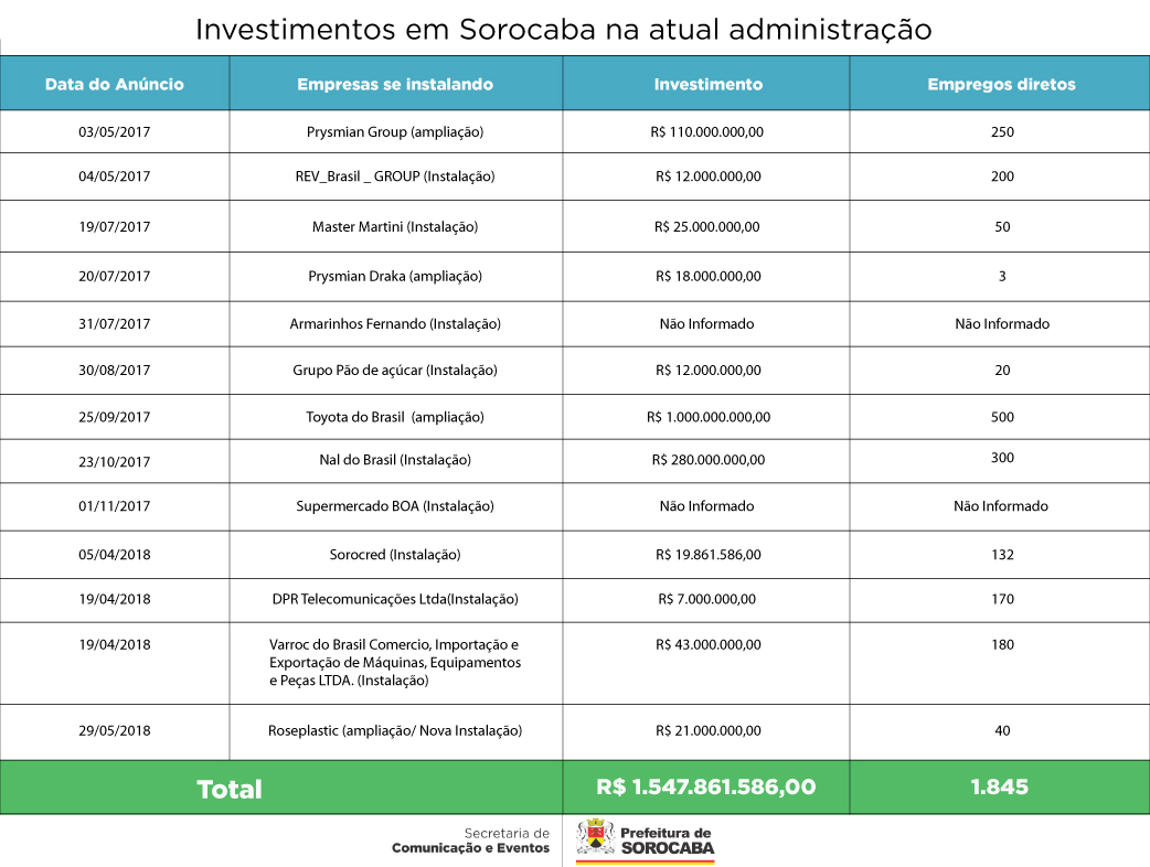 “Esse volume de investimentos anunciados e que a cada dia se efetiva é um sinal de que a cidade possui um ambiente de negócios atrativo, apesar das dificuldades e incertezas impostas pela crise econômica e política que o País enfrenta”, disse o prefeito José Crespo, que completou: “Desde que este governo tomou posse, em janeiro de 2017, temos realizado um amplo trabalho no sentido de criar ações e projetos que visam conceder incentivos para estimular a indústria, o comércio e prestadores de serviços, além dos centros de distribuição, condomínios industriais e as unidades de logísticas que venham a se instalar em território sorocabano.”